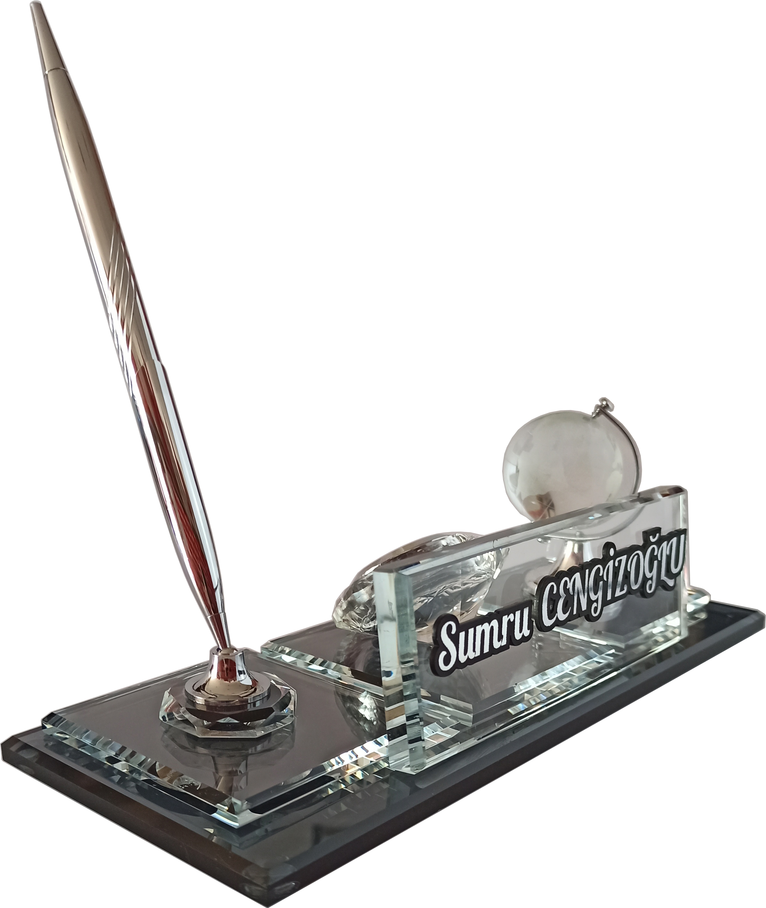 Kişiye Özel Cam & Kristal Masa İsimliği, üstün işçiliği ve modern tasarımıyla her masaya prestij katan özel bir dekorasyon ürünüdür. Özenle işlenen isim ve unvan detayları sayesinde hem şık hem de profesyonel bir görünüm sunar.